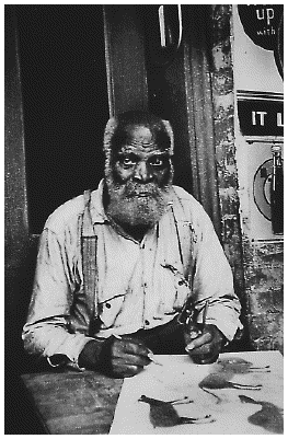 He was born before the Civil War, and died after WWII. He lived the first dozen or so years of his life as a slave, and then stayed on the plantation as a share-cropper until 1935, when he moved to Montgomery, Alabama. Four years after arriving, he installed himself on Monroe Avenue, in front of a fruit stand, and began to draw.According to those who knew him, he had never drawn before, had never taken lessons, apparently know nothing about "art" (and probably didn't think of what he was doing as "art") --- but there he was --- at age eighty-six, working like a madman. In the few years he was active, he made somewhere between 1,200 and 1,500 drawings of animals, people, the street-life, houses with animals and animals with houses and people all around them. There were snakes, chickens, bears, blue-eyed lizards, birds (red), cats (blue), dogs (yellow), rabbits (blue), turtles (red). There were pitchers and bowls and what now we would call "abstract" designs. There were men with walking-sticks, men with one leg, men kicking, men smoking. men drinking and smoking men working, red, blue, and yellow men. You might call him a street-corner Matisse.